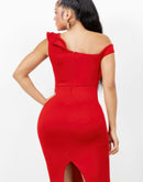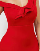 Turn heads at any event with the Monroe Asymmetric Ruffle Midi Dress, a striking blend of elegance and modern flair. Designed in a smooth stretch knit, this cocktail dress features an eye-catching asymmetrical one-shoulder neckline highlighted by a bold, layered ruffle detail. The fitted bodice with subtle princess seams and a waist-defining seam creates a flattering silhouette, while the bodycon shape hugs your curves beautifully. A knee-length hem with a back slit ensures both style and comfort, making this the perfect choice for weddings, cocktail parties, or special evenings out. Finished with a discreet back zipper, this dress combines statement style with polished sophistication.