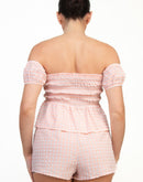 Step into effortless style with our Off-Shoulder Smock Gingham Top & Mini Short Set in Blush. This chic and playful set is perfect for casual days and sunny outings, combining a flattering off-shoulder top with high-rise mini shorts for a breezy, feminine look.