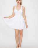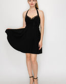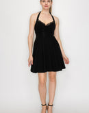 Design: Lace detailing, dramatic halter neckline, and a full skirt that adds a romantic, feminine touch to the dress