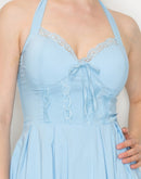 This dress blends sensuality and elegance. The corset-style bodice with adjustable lacing lets you create a custom fit, while the dramatic halter neckline and romantic full skirt make it an unforgettable piece for any event. The Sky Blue color brings a refreshing, dreamy feel that adds to the overall beauty of the dress.
