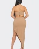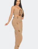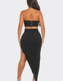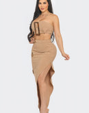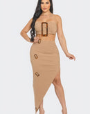 Introducing our Front Eyelet Buckle Belt Top and Skirt Set, a sophisticated ensemble designed to elevate your style effortlessly. This set features a sleeveless tube crop top with an oversized eyelet buckle belt detail at the front and a convenient back zipper. The coordinating maxi skirt complements the top with mini eyelet buckles and an open side slit, secured by a side zipper for easy wear.