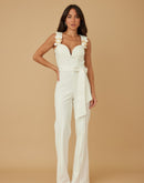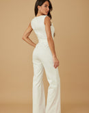 Sleek and sculptural, this intertwined ring detail jumpsuit makes a bold impression with its modern lines and standout accents. The deep curved upper neckline adds drama, while the intertwined ring and adjustable straps bring a unique, eye-catching focal point. Crafted from a smooth rayon-blend fabric with added stretch, it hugs the body comfortably while offering polished structure. Finished with a back zipper for ease and a seamless look, this jumpsuit is ideal for nights out, events, or elevated day-to-evening wear.