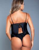 The Chastity Bodysuit combines sensuality with elegance, offering a flattering fit that enhances your natural shape. The lace detailing, cowl neckline, and open back make it a standout piece for any wardrobe.