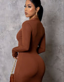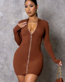 Turn heads with this sleek and sophisticated long-sleeve zip-front mini dress. Designed in a rich, warm chestnut hue, this figure-hugging piece offers a perfect blend of elegance and edge. Featuring a front zipper detail embellished with subtle sparkle, it allows you to customize your neckline for a daring or modest look.