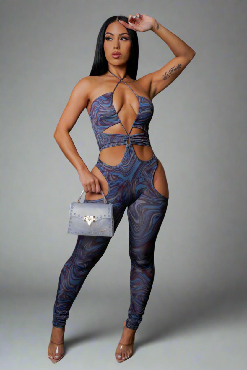 Unleash your bold side with this Unstoppable Desire Jumpsuit, a daring statement piece that combines striking design with unmatched allure. This halter-neck jumpsuit features a mesmerizing marbled swirl print in deep, moody hue...