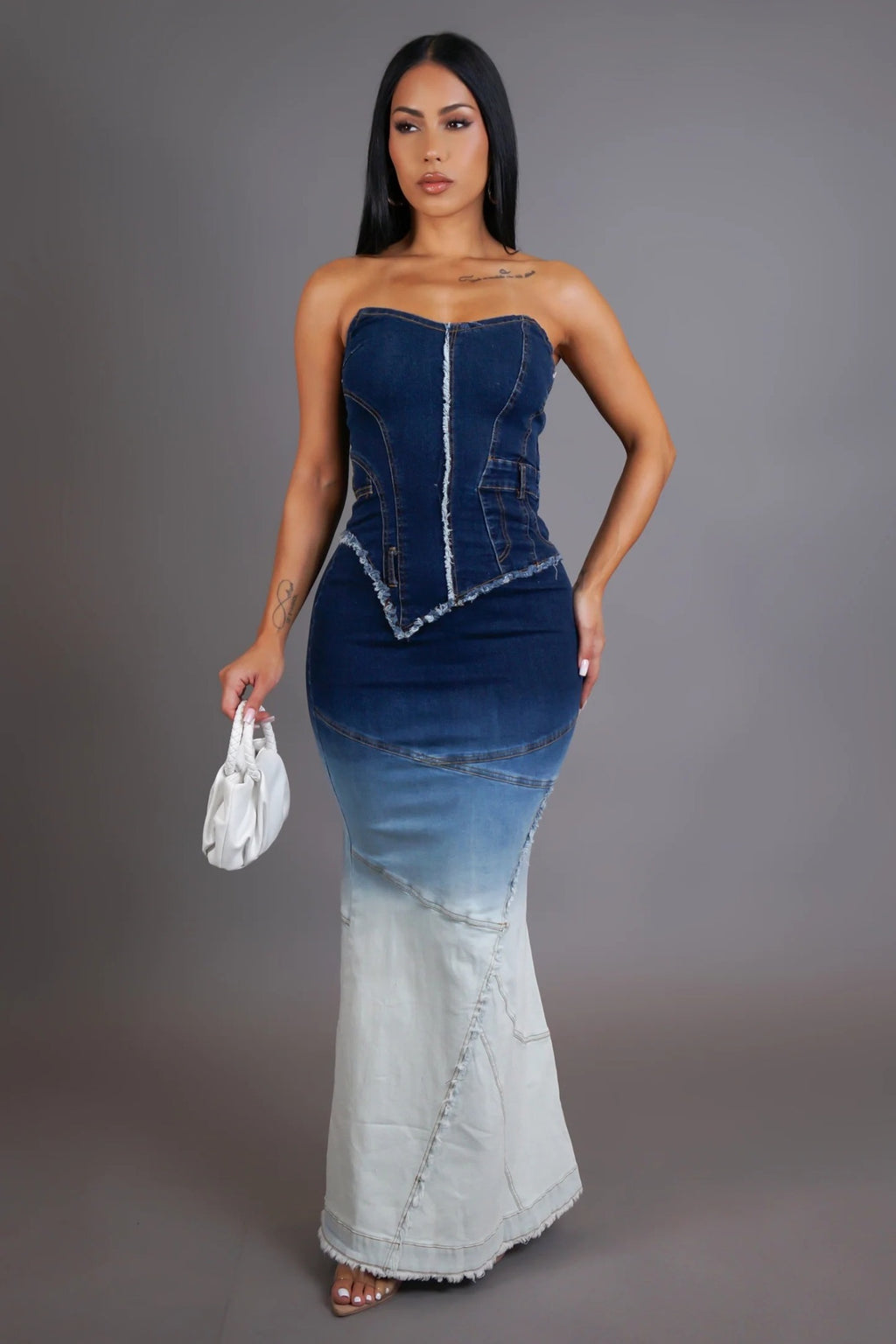 Elevate your wardrobe with this Two-Tone Denim Corset Maxi Dress, a show-stopping fusion of edge and elegance. Designed to highlight your curves, this strapless masterpiece features a structured corset-style bodice with exposed...