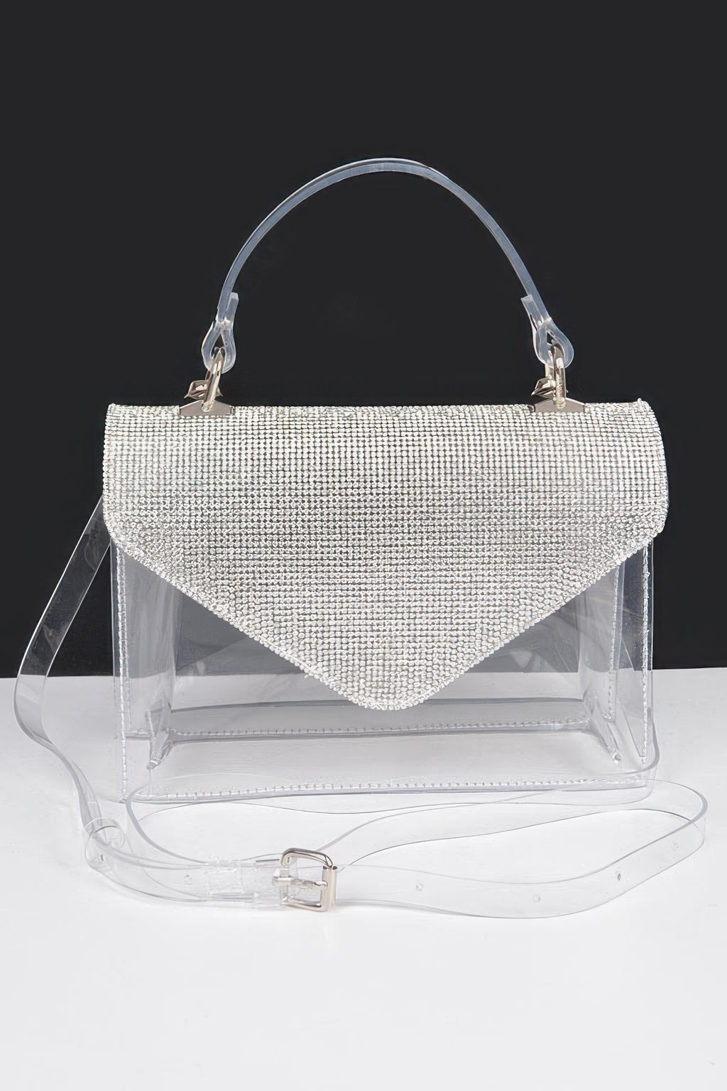Add a glamorous touch to your ensemble with our Transparent Rhinestone Top Handle Flap Bag, a sparkling and chic accessory designed to make a statement. This eye-catching bag blends transparent PVC with luxurious rhinestone de...