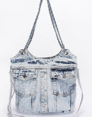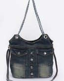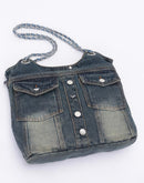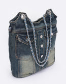 This tote bag stands out for its combination of style, practicality, and durability. With its spacious design and functional pockets, It's perfect for those who want both fashion and function in one accessory. The washed denim and mixed metal details ensure it complements a variety of outfits while remaining robust enough for daily use.