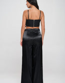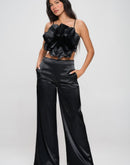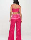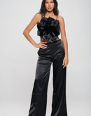 Fit: The crop top features adjustable shoulder straps for a customizable fit, while the high-rise pants offer a wide-leg silhouette that creates an elongating effect.