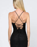 Textured coating knit sleeveless darwsrting lace back bodycon mini dre