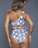 The Athena Swimsuit combines timeless elegance with a modern twist. The one-shoulder bandeau top and side bow tie add a playful, stylish touch, while the python print offers a unique, fashionable look that stands out in any setting.