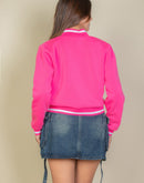 This jacket offers a unique blend of comfort, style, and versatility. The cropped design and varsity-inspired graphic make it a standout piece that can be dressed up or down, while the soft fabric ensures comfort on cooler days.