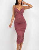 Elevate your style with our "Cross Wrap Ruched Midi Dress," a sleek and sophisticated piece that seamlessly blends modern design with timeless elegance. This dress features a stretch knit fabric, spaghetti straps, a cut-out front, V-neck, and a solid color, creating a chic and alluring look.