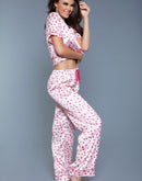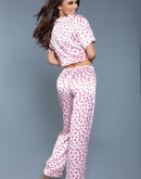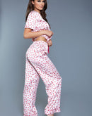 Unwind in effortless elegance with the Camellia pajama set, a two-piece ensemble crafted from silky satin for a luxurious feel. This set features a playful splotch print that adds a modern touch to classic sleepwear styling. The short-sleeve top is designed with a flattering V-neckline, button-down front, and dolphin hem, while the matching wide-leg pants include an elastic waistband and front satin drawstring for adjustable comfort. Decorative piping details complete the look with a polished finish. Perfect for lounging or a restful night’s sleep, this set combines style and softness in every stitch.