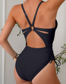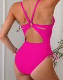 Solid Deep V Neck Drawstring Cross Back Swimsuit