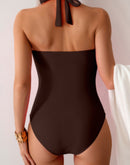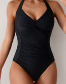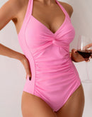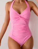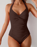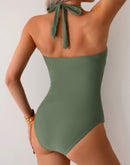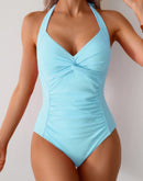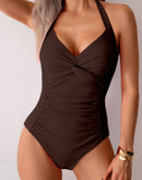 V Neck Halter One Piece Ruched Backless Swimsuit
