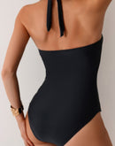 Turn heads with this sleek V neck halter one-piece swimsuit, designed to flatter and support with every wear. Crafted from a smooth blend of polyamide and elastane, it hugs the body comfortably while offering lasting stretch and durability. The plunging neckline and halter tie lend a timeless touch, while the ruched detailing at the back enhances your natural silhouette. A backless cut adds bold, confident appeal, perfect for sunny escapes and poolside lounging. Ideal for vacations, beach outings, or simply soaking up the sun in style.