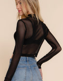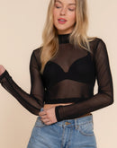Enhance your wardrobe with our Long Sleeve Mock Neck Mesh Top in classic black. Add versatility and effortless style to your look with this essential piece!