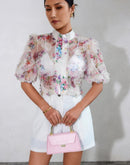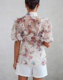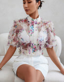 Allover Print See Through Collar Puff Sleeve Shirt