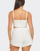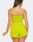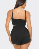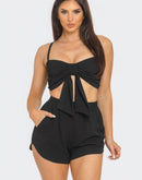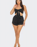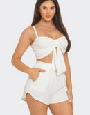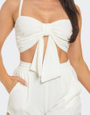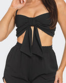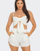 Introducing our Front Oversized Bow Twisted Tie Top and Shorts Set, a stylish and comfortable ensemble designed to elevate your summer wardrobe. This set includes a sleeveless crop top with a front oversized bow and a twisted tie detail at the back. It features elastic shirring smocking for a flattering fit and comes with elastic waistband shorts that include convenient side pockets.